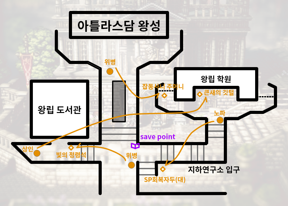 그렇다면 가게 매입 2,400 + 회복 잼 1,500 + 마을 오기 전 서브스토리 보상 1,500하여 총 5,400원을 얻을 수 있다. 지하 연구실에서 레벨 6을 만들기 위해 전투를 어느정도 치렀다면, 전투 보상으로 2,000원~3,000원 정도는 현재 있었을 것이다. 이 시점에서 스태프를 살 수 있는 사람도 있을 것이고 조금 부족한 사람도 있을 것이다. 아래 맵을 참고하여, 탐색을 통해 돈이 될만한 잡동사니들을 더 구해보자.