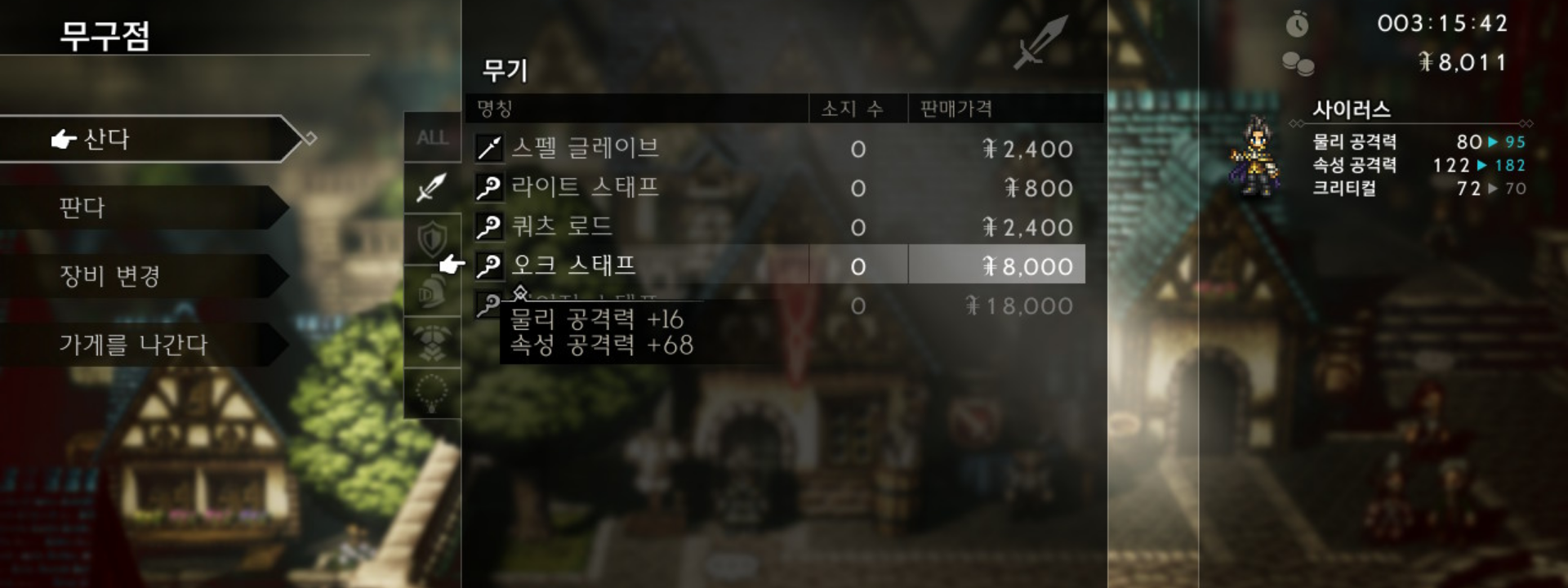 아마 저것보단 여유로울 것이다. 오크 스태프는 속성공격력을 68이나 올려줘, 스태프 교환만으로 속성공격력이 60이 상승한다. 또한 사이러스는 전투에 SP를 많이 사용하는 캐릭터이다. 따라서 레벨이 낮을 때는 되도록 SP를 올려주는 방어구를 착용해주면 앞으로의 진행에 편하다. 여유가 된다면, 써클릿과 정신의 목걸이도 구매해주자.