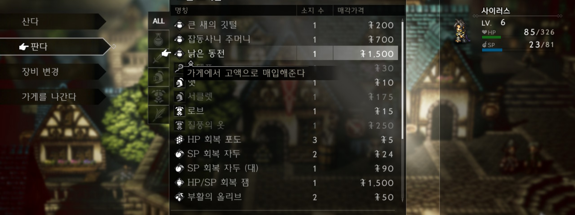 던전에서 얻은 소모성 아이템은 회복을 하거나 속성 공격을 해주는 전투 보조 아이템도 있지만, 맨 위에 주머니 모양의 어떤 기능도 가지고 있지 않고 오로지 상점에 파는 용도만 있는 아이템들도 존재한다. 낡은 동전의 경우에는 1,500원으로 꽤나 비싸게 값을 매겨주니 전부 다 팔아주도록 하자. 그리고 러셀을 잡아서 얻은 'HP/SP 회복 잼' 은 1인의 HP, SP 전체를 회복해주는 정말 좋은 아이템이지만, 어차피 레벨이 낮아서 당분간 쓸 일이 없으니 돈을 벌기 위해 이것도 팔아주도록 하자.