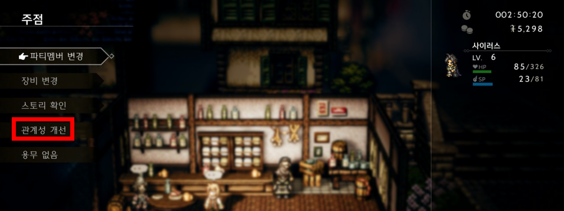 주점의 바텐더가 해당 업무를 보고 있으며, 관계성 개선이라는 탭을 통해 회복이 가능하지만, 꽤 많은 돈이 든다. 그러므로 되도록이면 관계성이 악화되지 않도록 유의하도록 하자.