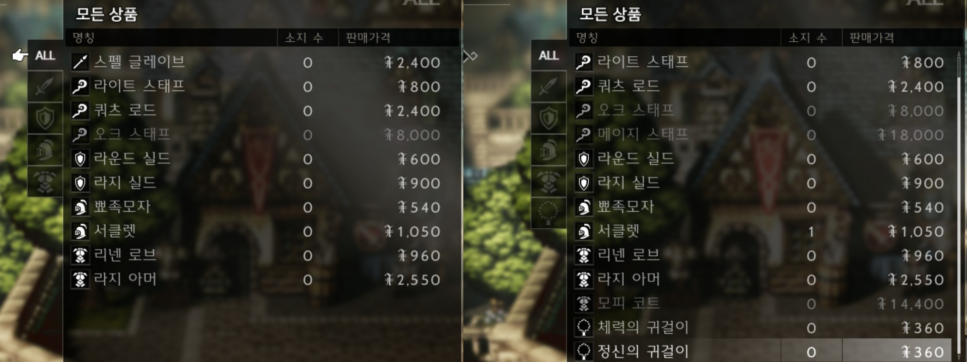 왼쪽이 위병에게서 탐색을 하기 전이고 오른쪽이 탐색으로 "무기점의 상품 추가 정보"를 얻은 뒤의 모습이다. 이렇게 "탐색"의 결과로 판매하는 상품이 늘어나기도 한다. 우선 이 마을을 떠나기 전 "오크 스태프"를 구매하는 것을 목표로 해보자. 아직 돈이 부족해 회색으로 표시되어 있으니, 지하 연구실 던전에서 얻은 아이템을 판매하여 돈을 마련해야 한다. 왼쪽에 '판다' 탭으로 이동해보자.