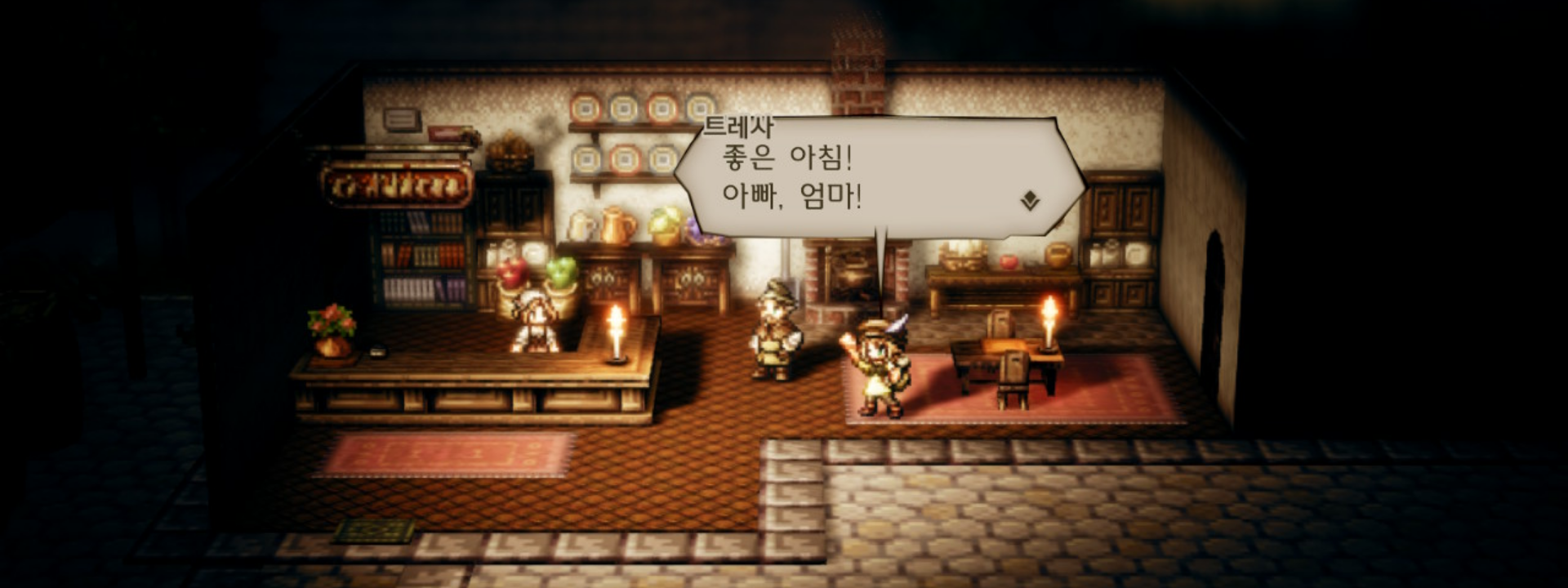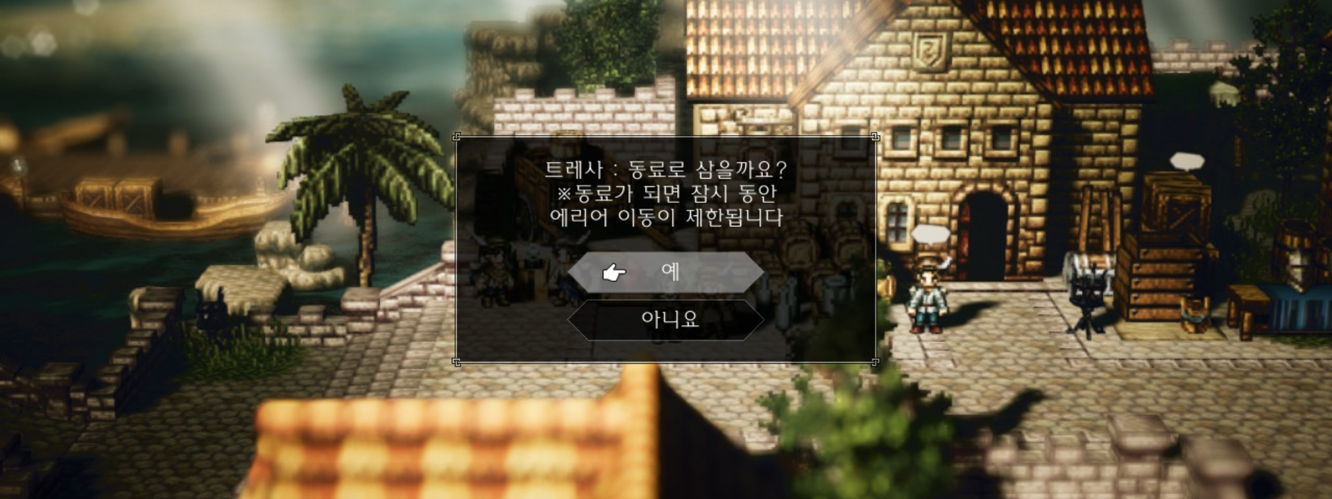 그러면서 트레사를 동료로 삼을 것인지를 물어본다. 예를 선택하면 지금까지 사이러스로 스토리를 진행해왔던 것처럼 트레사를 중심으로 스토리가 진행되고, 마을 간 이동이 제한된다. 트레사의 이야기를 들어보도록 하자.