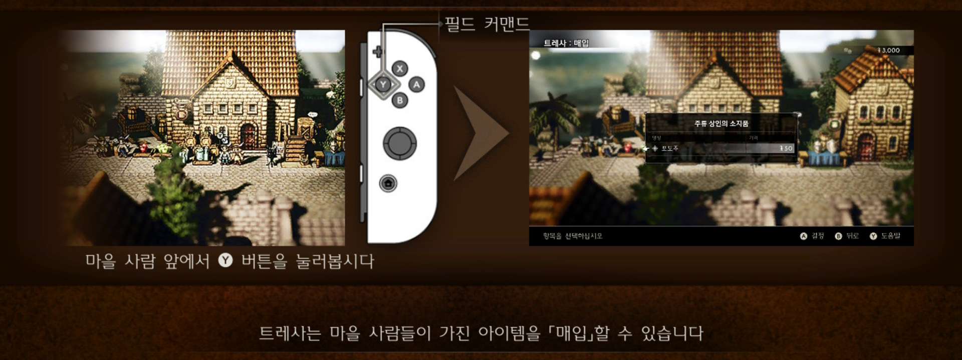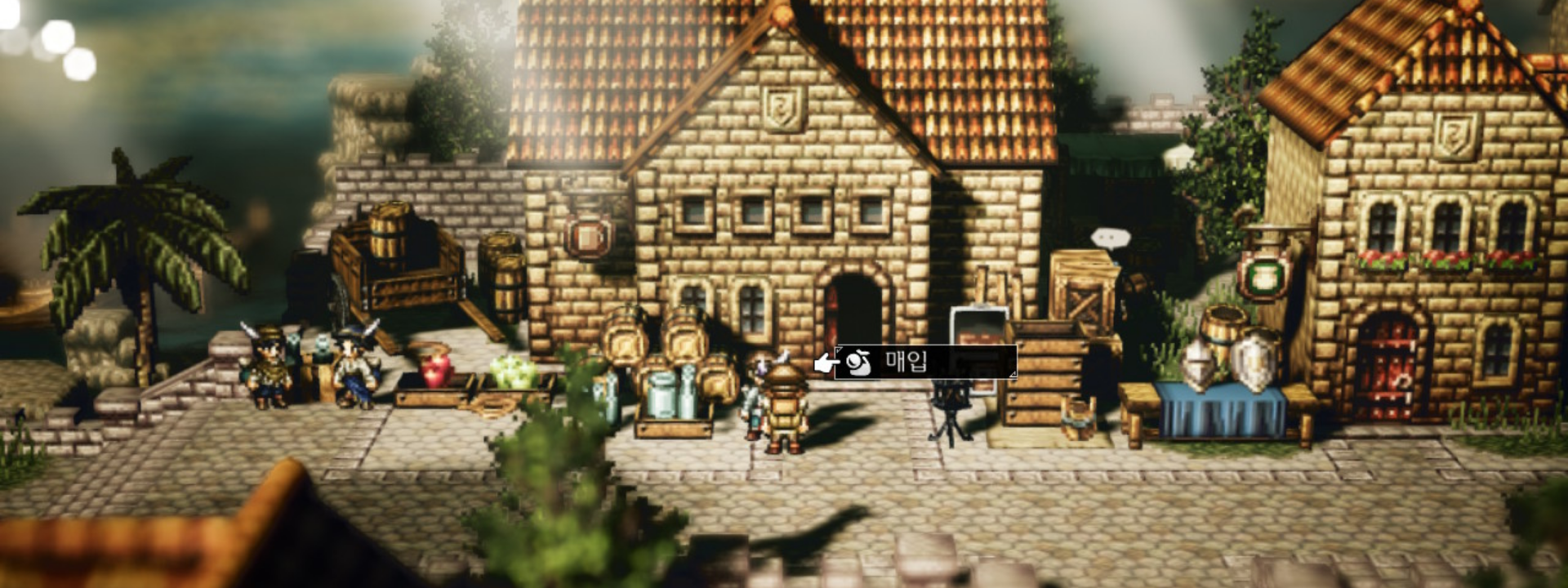 사이러스에게는 NPC에게서 정보를 캐내는 "탐색"이 있었다면, 트레사에게는 NPC가 가지고 있는 물건을 특정 금액을 지불하고 가져올 수 있는 "매입"이라는 필드커맨드가 있다. 이를 사용해보는 튜토리얼과 같은 진행이다. 우선 술을 매입하기 위해 술을 구하기 쉬운 곳! 주점으로 가보자. 주점은 마을 가운데 위치해 있다.