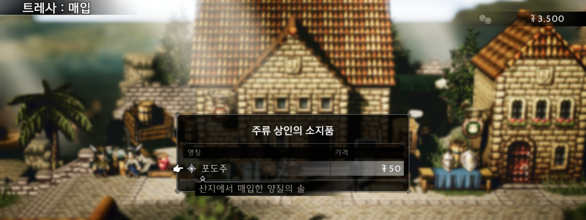 주류 상인으로부터 구매할 수 있는 물품이 나온다. 퀘스트 진행 중이기에 여기선 50원에 살 수 있는 포도주만 나오지만, 보통의 경우 여러 아이템을 팔며, 무기류를 팔기도 한다. 우선은 50원을 지불하고 포도주를 구입하자.