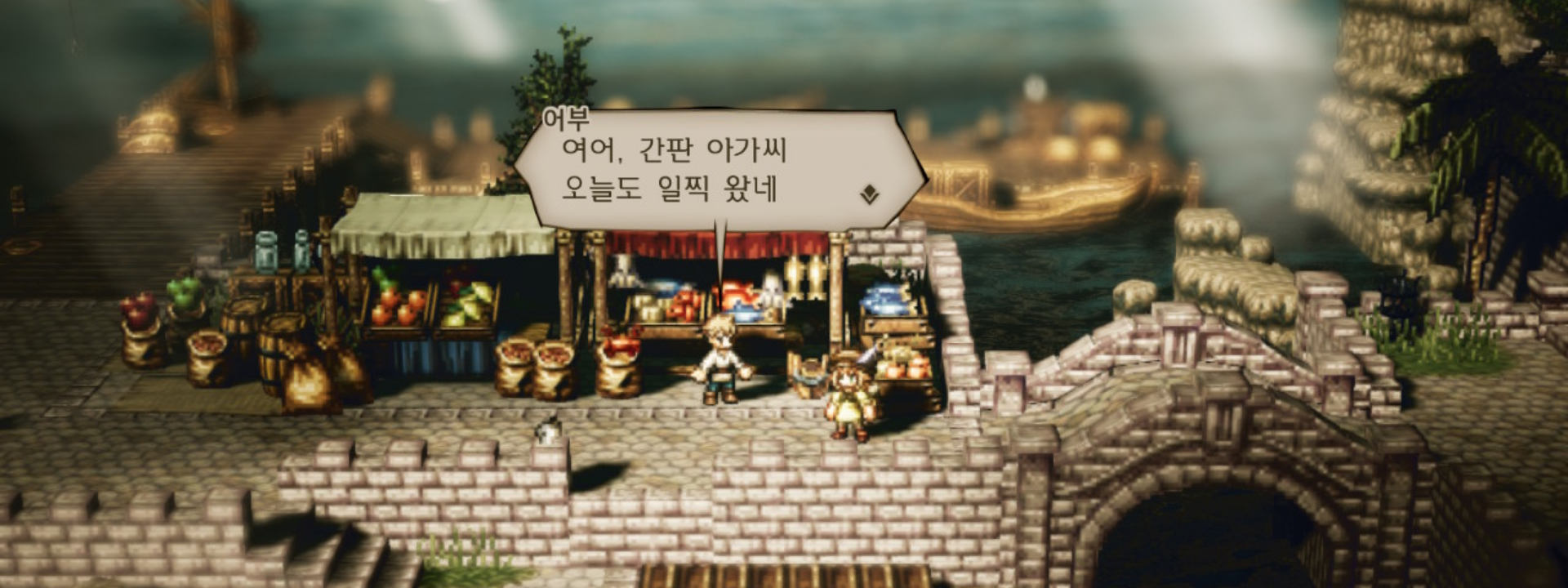 어부를 만나 오늘 팔 물건을 매입하러 가자. 어부는 마을의 왼쪽의 항구에 있다. 항구로 가보자.