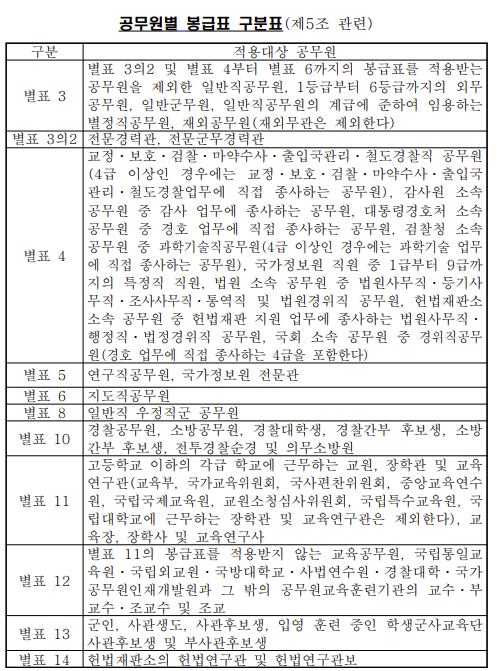 별표 4 : 공안직공무원의 봉급표이다. 일반적인 공무원보다 봉급이 조금 더 많다.