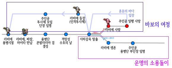 운명의 수레바퀴를 얻은 시점에서 오리지널 스토리는 주인공이 그대로 혼돈의 바다에 남아 낙원의 에너지를 모아 운명을 바꾸는 여정을 계속하게 되고, 운명의 소용돌이는 이후 지하감옥에서 라비에가 생존하게 되어 격랑성 전투를 벗어나 용병단 "콘발라리아의 검"으로 돌아오게 되는 스토리이다.