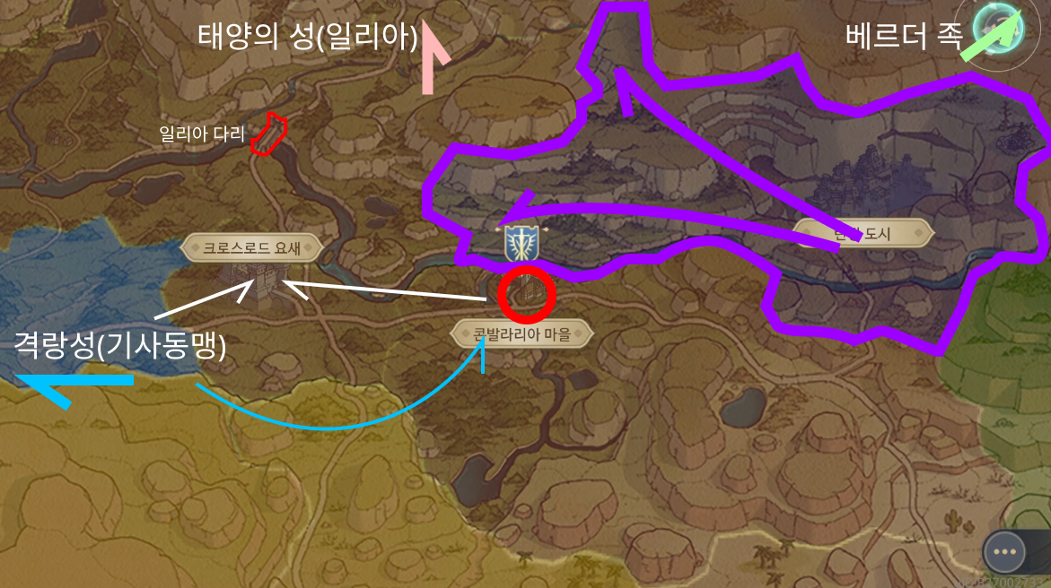잠시 지도를 통해 세력의 움직임과 왜 기사 동맹이 우리를 돕는지에 대해서 살펴보자. 암흑의 빛은 자신들이 머물고 있는 빈민촌 "탄광도시"에서 나와 서쪽으로 세력을 확장하고자 한다. 이 세력의 확장에 걸림돌이 되는 곳이 바로 지금 보이는 콘발라리아 마을, "스즈란 용병단"이다.