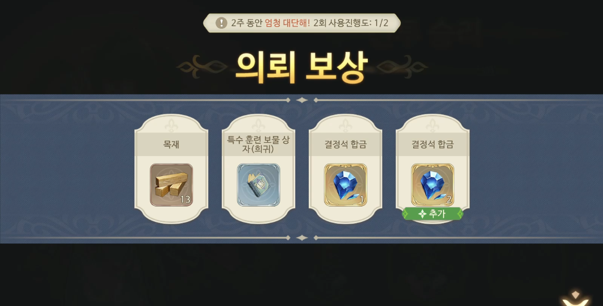 그렇게 모든 적을 마무리하면, 전투 종료. "결정석 합금"이라는 새로 보이는 보상이 있다. 우리가 기사 동맹을 협업자로 선택하면서 생겨난 보상으로 앞으로 이 합금을 통해 무기 제작도 하는 등 여러 방면으로 쓰일 게 될 것이다.