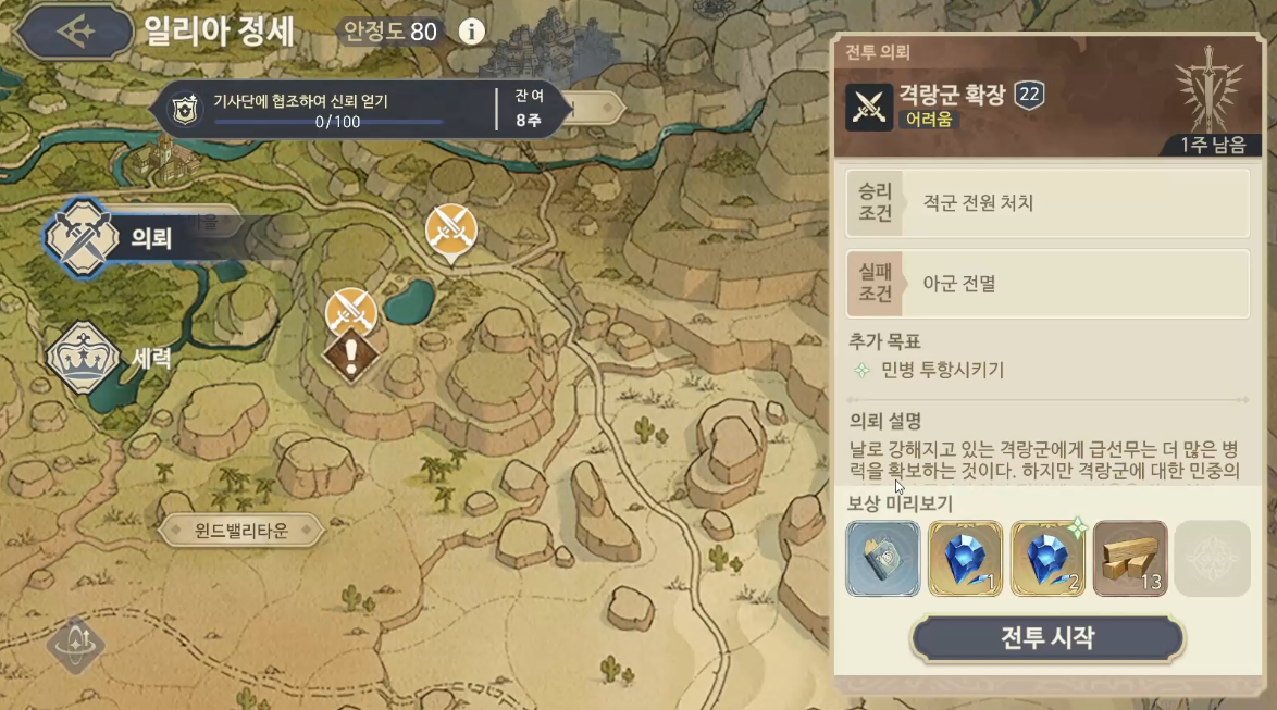 지난 챕터와 마찬가지로 1회차 플레이다보니, 최대한 챕터 목표를 달성하는 방향으로 의뢰를 수락하도록 한다. 이번에 진행할 의뢰는 "격랑군 확장". 기사동맹평판과 임무목표를 +10씩 올려준다
