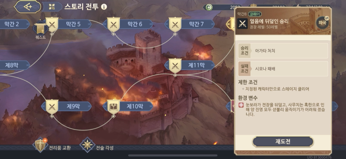 게임의 컨셉은 일리아 다리 수호전. 불타버린 대지위에 11막에서는 실버울프 용병단 입장에서 시모나를 막은 것이라면, 이번 막간8은 시모나의 입장에서 이들을 뚫어내는 것이다