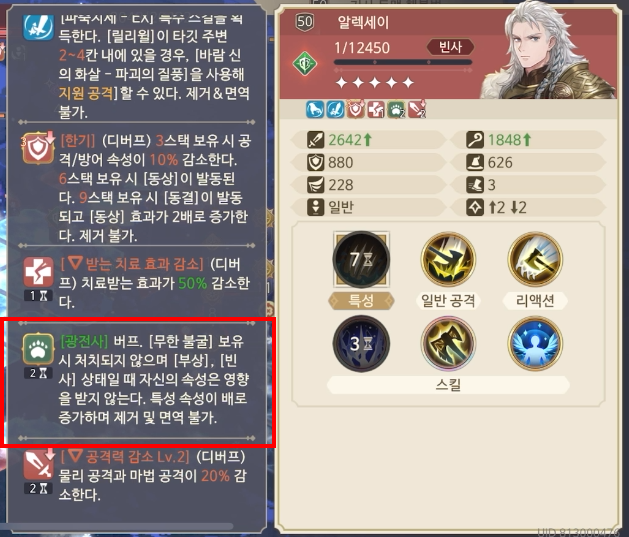 둘째로 알렉세이의 "불굴" 이 문제가 된다. 사실 릴리윌은 방어력이 약해 바로 처치가 가능한데, 알렉세이는 잡는 것도 어렵긴 하지만, 잡고 나서도 2턴 간 광전사 버프로 인해 무한 불굴을 받아, 우선 2턴간 무적이 된다는 점이다. 2턴간은 무슨 공격으로도 죽지 않는다.