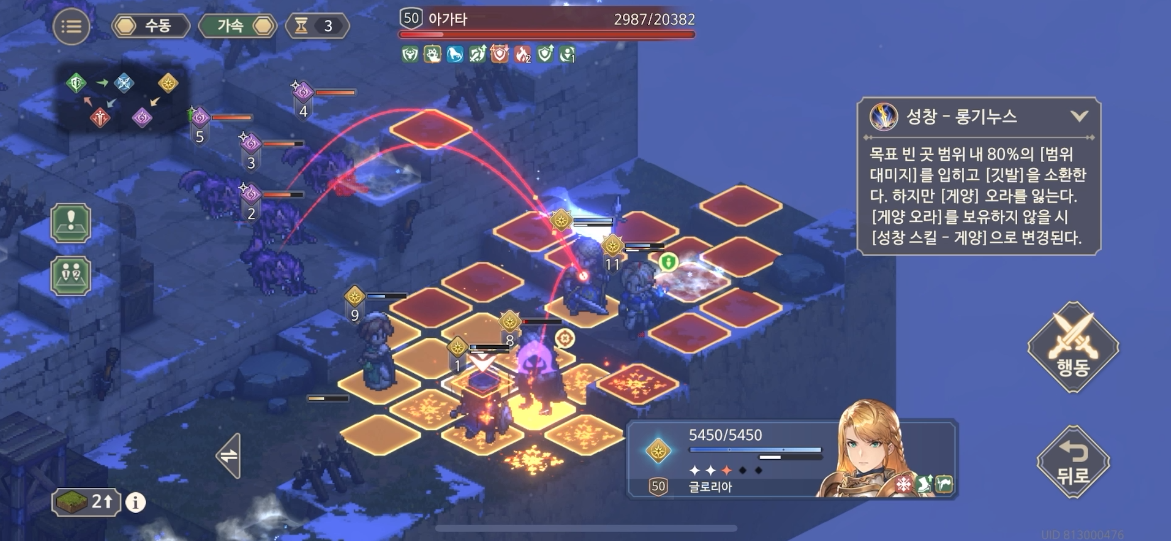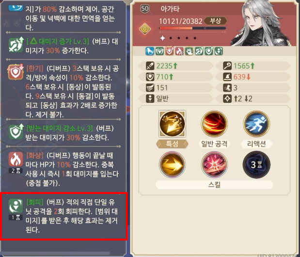 즉, 내가 알렉세이를 잡은 시점에, 그것도 딜을 넣을만한 유닛을 3명 가지고 있다면, 2명은 사실상 회피되니, 1명만 딜을 넣을 수 있다. 그렇다해서 그 순서를 내가 정할 수 있는 것도 아니다. 순서가 정해져 있는 턴제 RPG이기 때문이다. 그럼 두가지 중 하나를 선택해야 한다. 알렉세이를 처치하는 시점에 최대한 많이 살려 놓던지, 아니면 회피에 영향을 받지 않는 범위공격 딜러를 버프를 많이 줘서 잘 키워두던지 말이다.