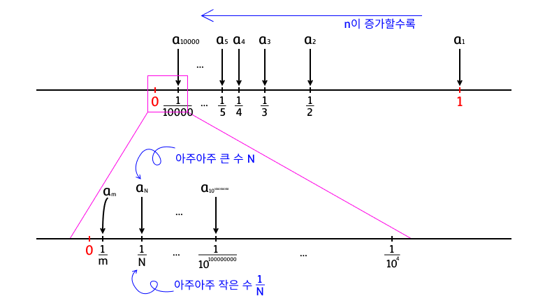 즉, 임의의 아주아주 큰 자연수 N이 있더라도 그보다 큰 자연수 m은 항상 존재하므로, a(N)보다 0에 가까운 수열의 구성원 중 하나인 a(m)이 반드시 존재한다는 것을 의미한다. 이 때의 m도 아주아주 큰 자연수이니 N으로 다시 바꿔볼 수 있고, 그 N보다 큰 자연수 m은 또다시 존재하여 이 a(N)보다 0에 가까운 a(m) 역시 또다시 존재하게 된다. 이렇게 무한히 반복하게 되면, 결국 N이 무한히 커지면 커질수록 a(N) = 1/N은 점점 0에 가까워지는 수가 되고, 결국 1/N과 0의 거리는 아주아주아주 짧은 거리가 될 것이다.