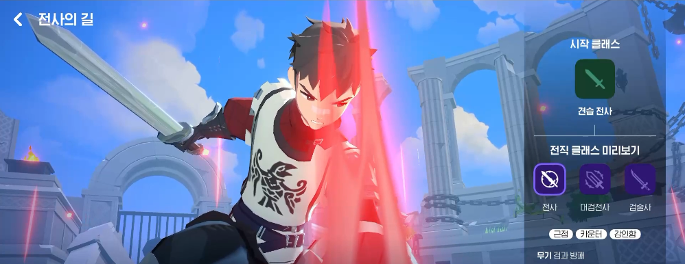 견습전사는 방패를 함께 쓰는 전사, 대검을 쓰는 대검전사, 카타나를 사용하는 검술사로 전직이 가능하다